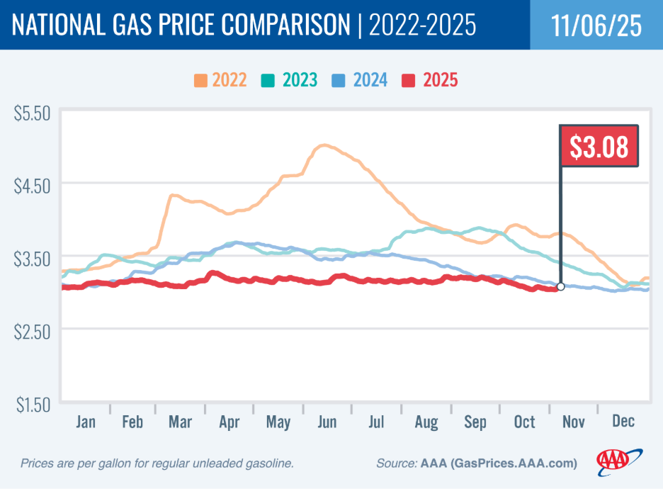 Gas prices remain relatively stable as November kicks off. The national average for a gallon of regular went up nearly 5 cents since last week to $3.08. Refinery maintenance in California is part of the reason for the increase: when refineries pause production, gas prices in the area temporarily go up. Still, the national average is lower than it was this time last year, and gas prices should remain on a quiet path as we get closer to Thanksgiving.